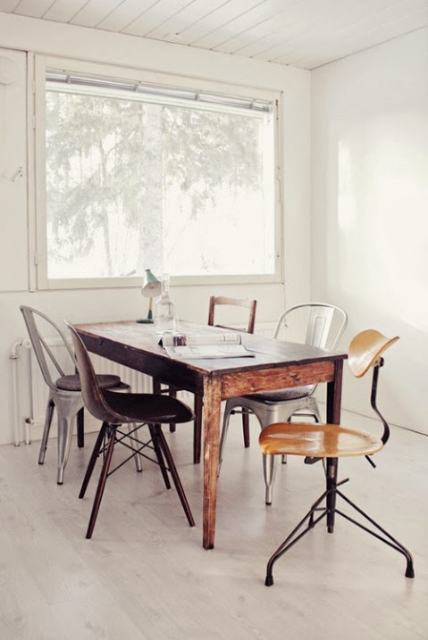 What has consumed me most over the last few weeks, seeing the table sit lonely in the dining area, is the subject of chairs. I've paged through many different sites, looking for chairs to pair with this big old table. At first I thought I wanted a mix of different modern type chairs or maybe a set up with a long bench on the one side. I especially love the juxtaposition of the older wood table and modern chairs below.