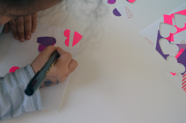 Love is in the air and valentine making season is at hand. It has become tradition around here to hand make valentines for our loved ones each year. Last year, we tried our hand at potato and tp roll stamping to create some paper love. This year, we decided to use washi tape. We also added Ella's colored masking tape, featured here, into the mix. And the results . . . they just make me happy. I made some basic punched hearts and Ella, some heart stickers. We then attached the hearts to cards and added a note (or drawing in Ella's case). Here's how we did it!